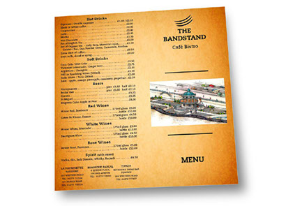 Typical table menus are 4pp A4 (A3 folded in half) or A3 folded in thirds, printed in full colour on both sides and gloss or matt laminated with the edges left on or trimmed off. Typical takeaway menus can be A4 folded in thirds to ‘DL’ size, printed in full colour on both sides.